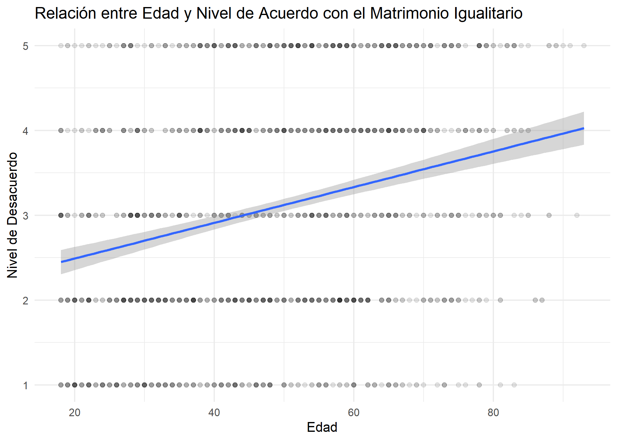 Finalmente, vamos a visualizar la relación entre la edad y el nivel de acuerdo con el matrimonio igualitario mediante un gráfico de dispersión, añadiendo la línea de regresión. Dado que estamos trabajando con una gran cantidad de casos, y con variables con pocos niveles, es importante que asignemos un valor de transparencia bajo a los puntos para que el gráfico de dispersión sea informativo.