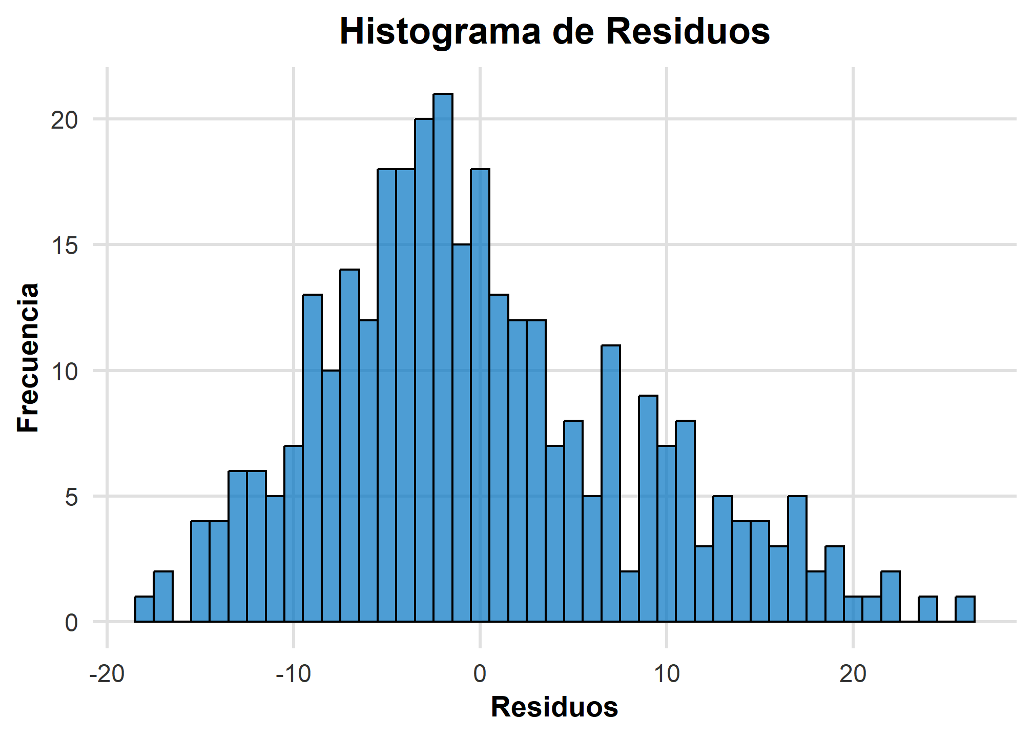 - Asimetrías o colas largas: Si el histograma muestra asimetrías pronunciadas o colas largas, esto puede indicar que los residuos no son normalmente distribuidos, lo que podría sugerir la necesidad de revisar el modelo.