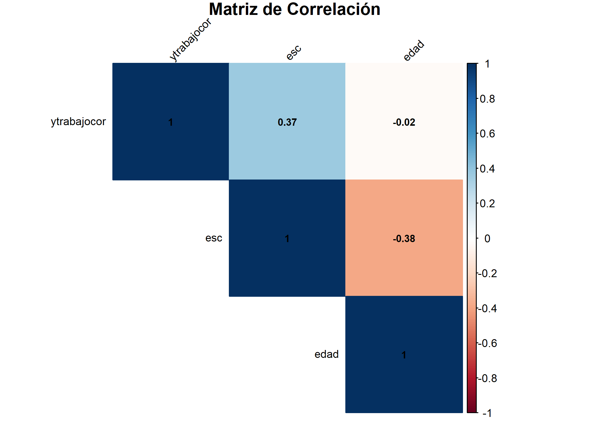 Primero, analizamos cómo los años de escolaridad y la edad afectan los ingresos del trabajo. Empezamos con una exploración de las correlaciones entre estas variables y realizamos regresiones lineales simples y múltiples.
