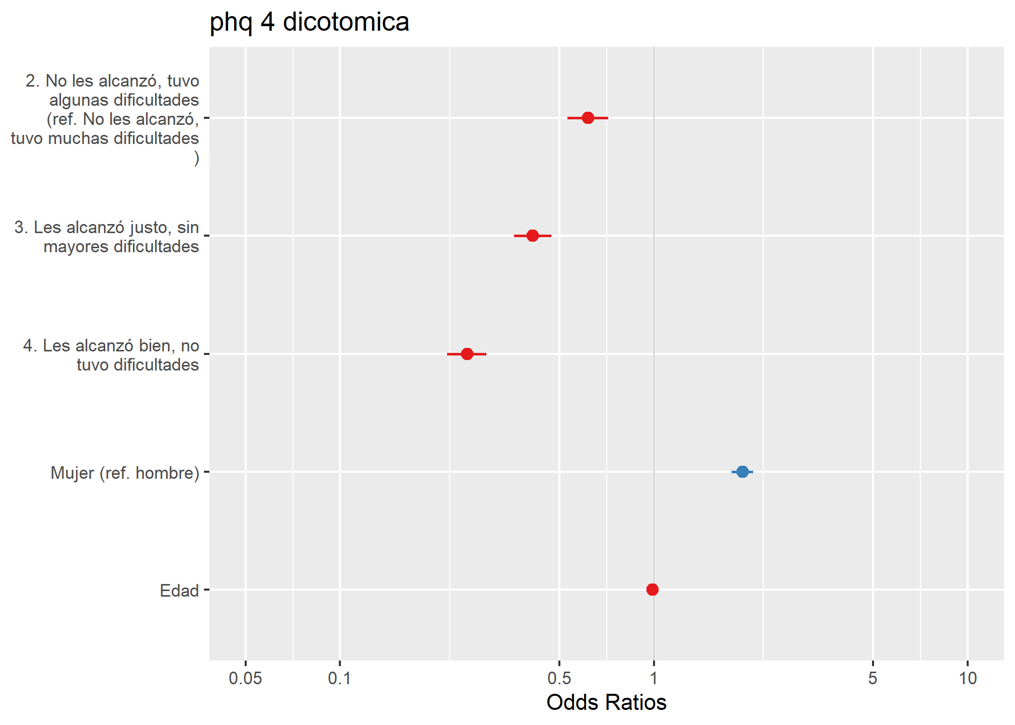 - Aquellos que dijeron que “les alcanzó justo, sin mayores dificultades” tienen un 59% menos de chances de tener sintomatología depresiva en comparación con aquellos que tuvieron muchas dificultades económicas, controlando por las demás variables del modelo. Este efecto es estadísticamente significativo con un 99,9% de confianza (p < 0.001).