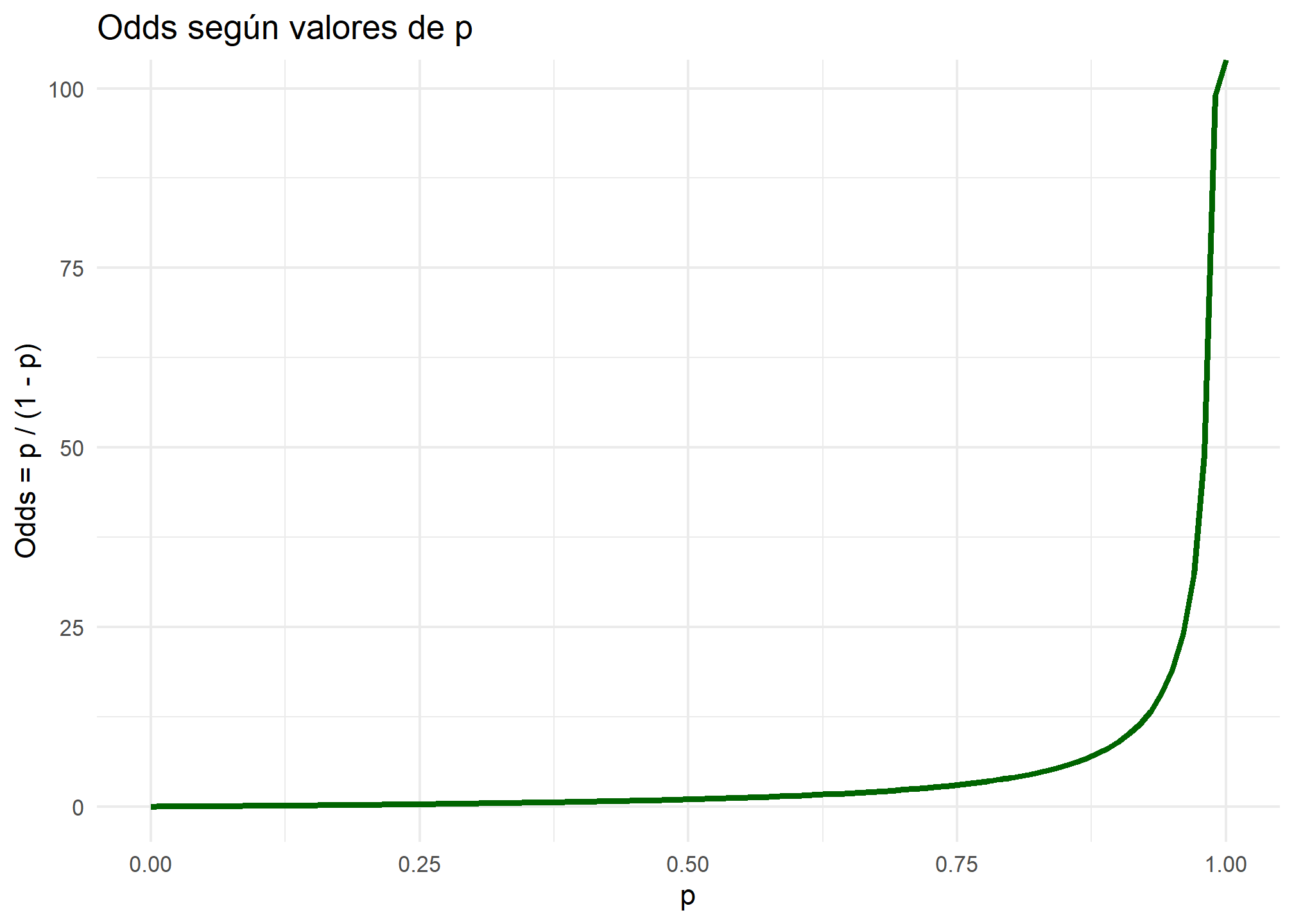 labs(title = "Odds según valores de p", x = "p", y = "Odds = p / (1 - p)") +