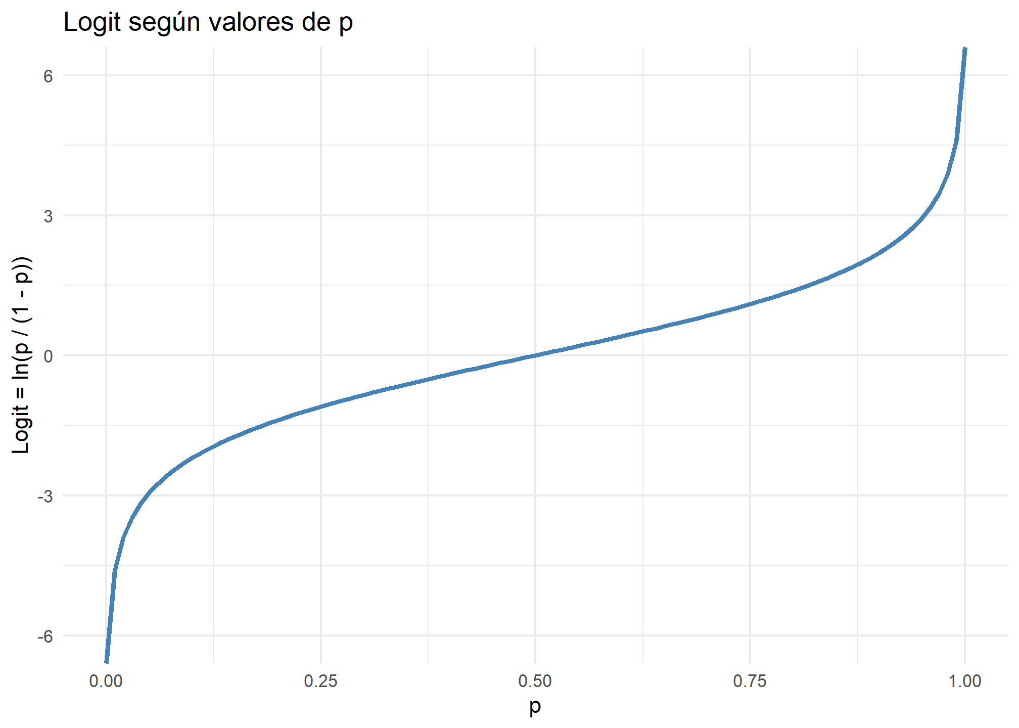 labs(title = "Logit según valores de p", x = "p", y = "Logit = ln(p / (1 - p))") +