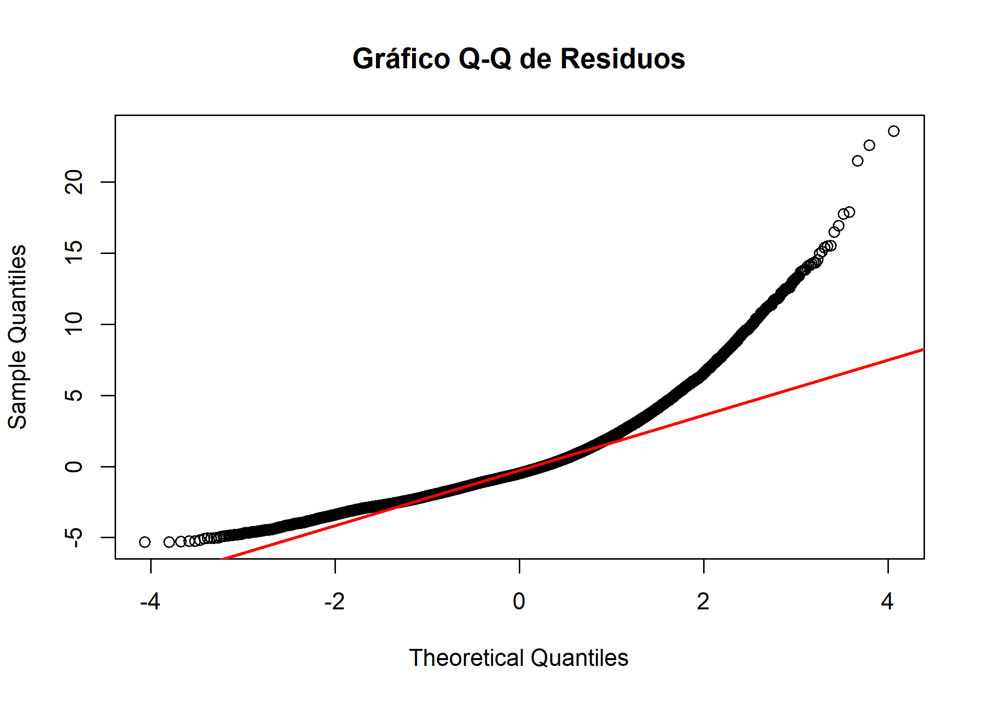 Otra forma común de evaluar la normalidad de los residuos es mediante un gráfico Q-Q (Quantile-Quantile), que compara los cuantiles de los residuos con los cuantiles de una distribución normal teórica.