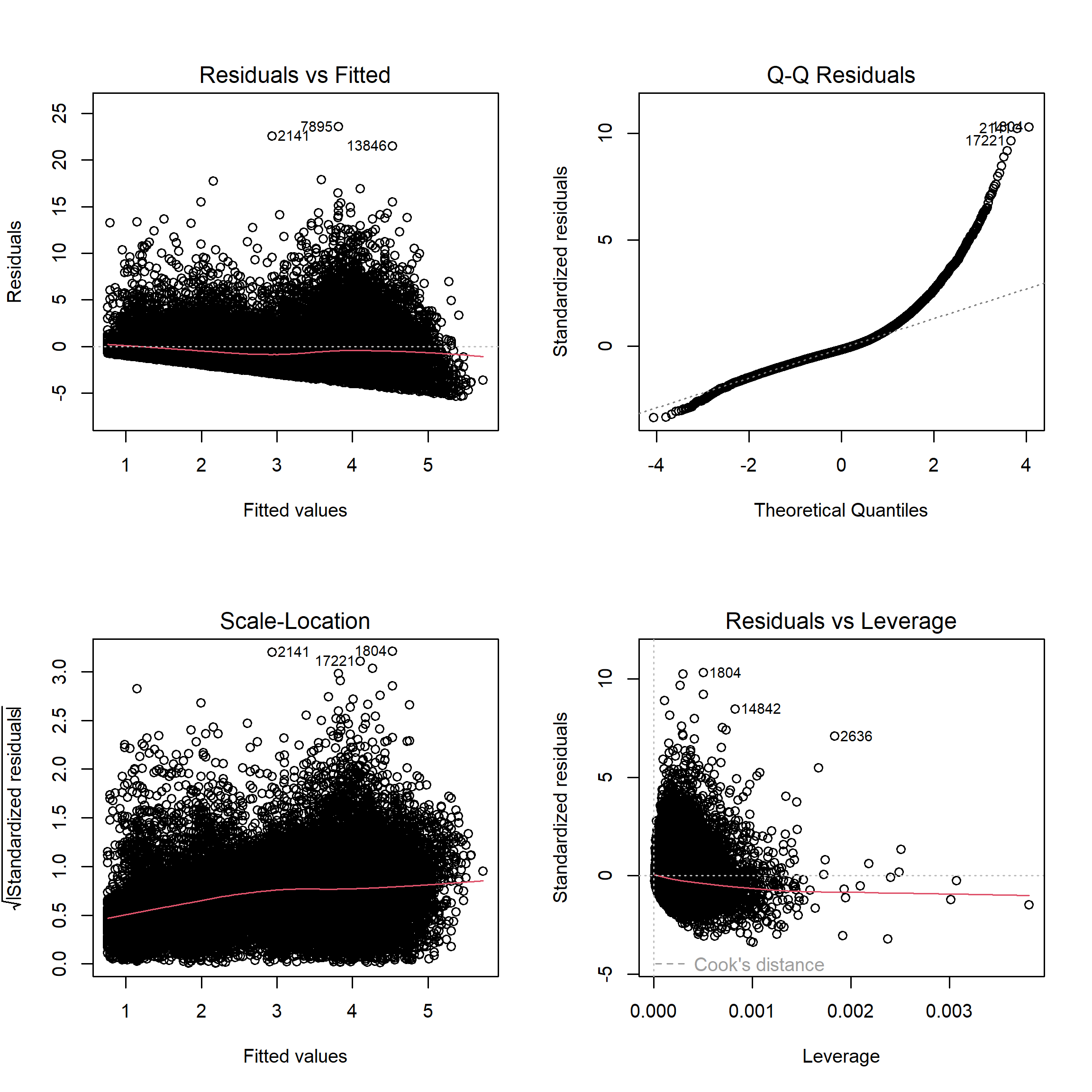 Escala de Localización (Scale-Location): Este gráfico permite verificar la homocedasticidad de los residuos. Se espera una línea horizontal con puntos aleatoriamente dispersos. Si hay un patrón claro, podría indicar que la varianza de los residuos no es constante.