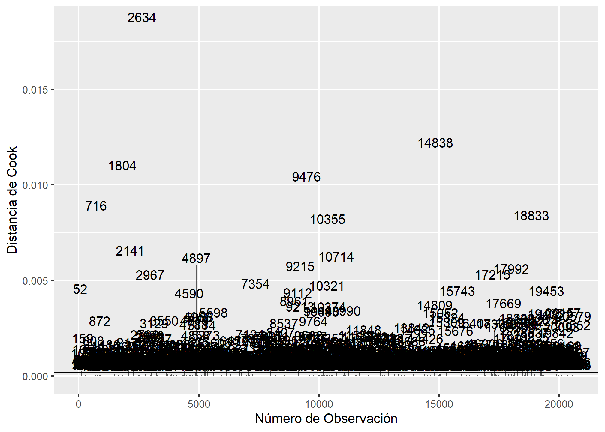 La Distancia de Cook mide el impacto de cada observación en los coeficientes del modelo. Se calcula un punto de corte con la fórmula 4/(n-k-1), donde n es el número de observaciones y k el número de parámetros del modelo.