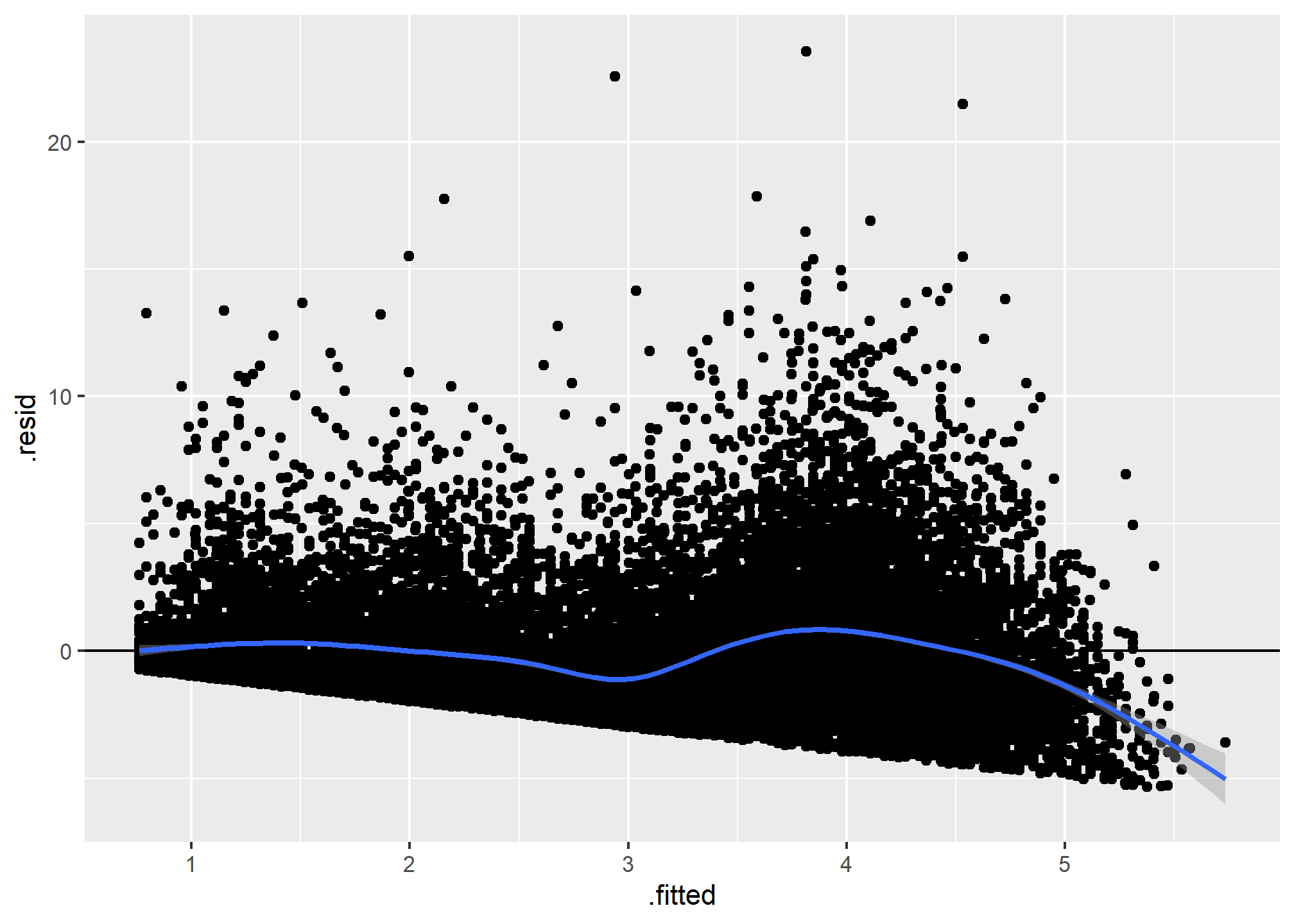 Un patrón no aleatorio en este gráfico podría indicar una violación del supuesto de linealidad. Si observamos un patrón claro, como una curva o una forma en U, puede ser una señal de que la relación entre las variables independientes y la variable dependiente no es estrictamente lineal. Esto sugiere que la relación no se está capturando correctamente con un modelo lineal simple, lo cual podría afectar la validez del modelo y la interpretación de los coeficientes.