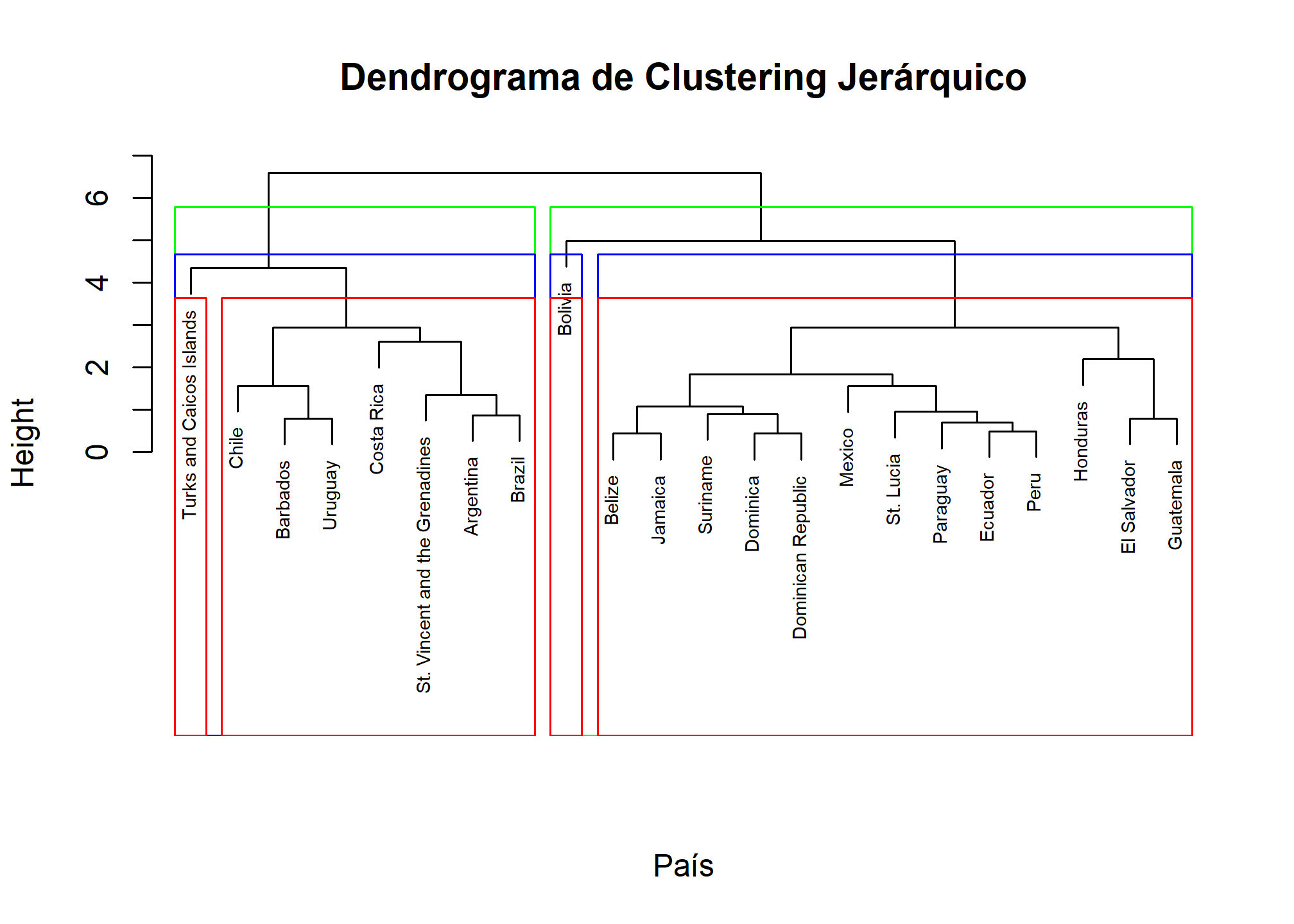 Hemos decidido cortar el dendrograma para obtener 3 conglomerados, representados por los rectángulos azules. Los países dentro de cada conglomerado tienen características socioeconómicas similares.