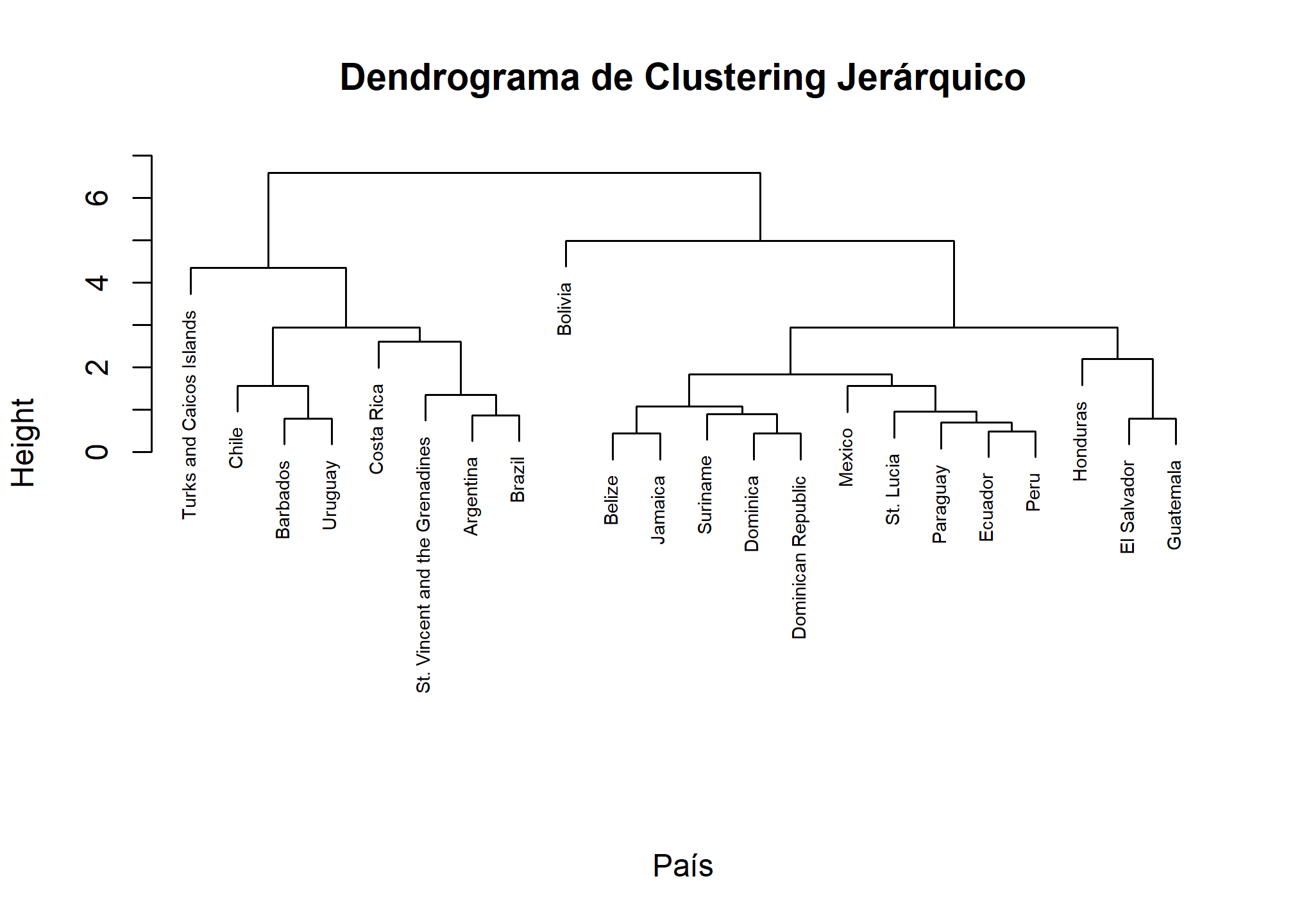 El dendrograma muestra cómo los países se agrupan de manera jerárquica. La altura de las líneas en el dendrograma indica la distancia a la cual los conglomerados se unen. Podemos observar a qué nivel de corte se forman diferentes conglomerados.