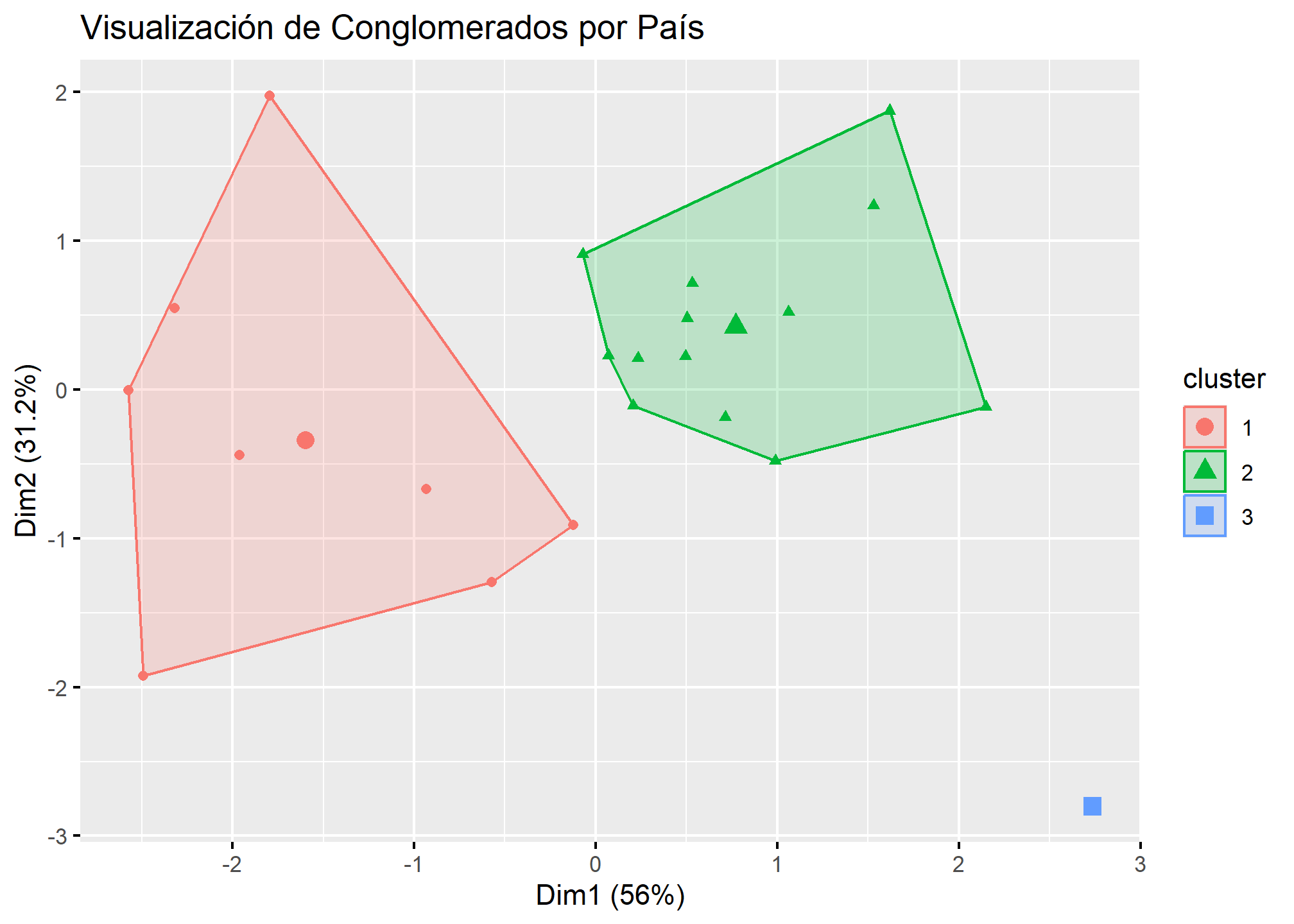 geom = "point", labelsize = 10, main = "Visualización de Conglomerados por País")