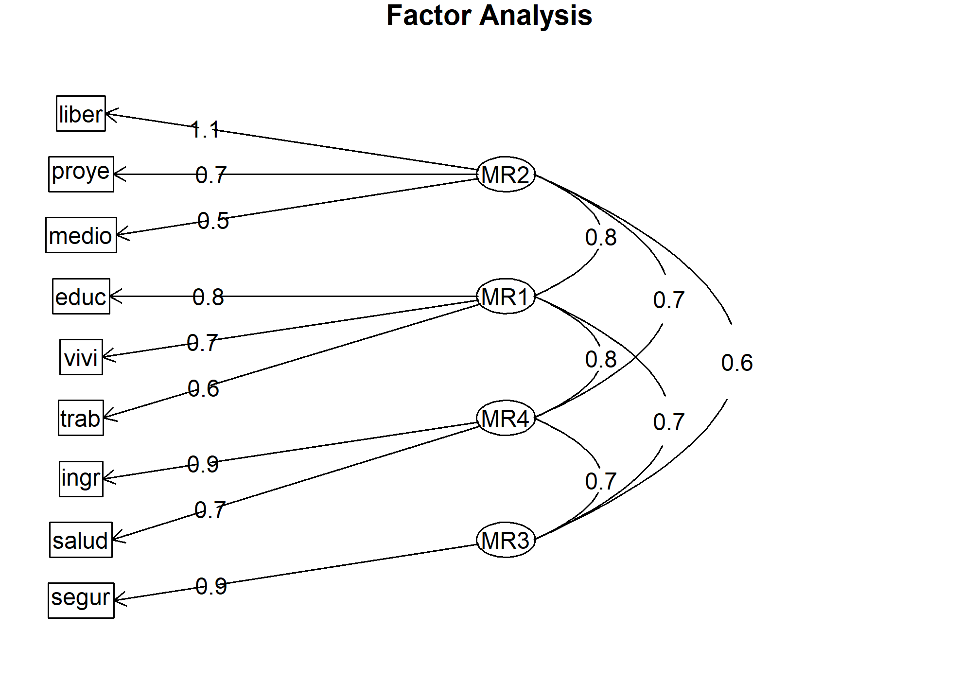 Podemos observar los resultados del análisis con el comando fa.diagram(), que nos muestra las cargas factoriales de los ítems del modelo con cada uno de los factores latentes.