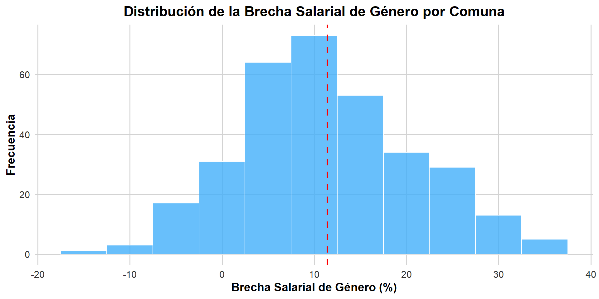 Pudimos observar que la brecha salarial de género tiene bastante variación entre distintas comunas del país.