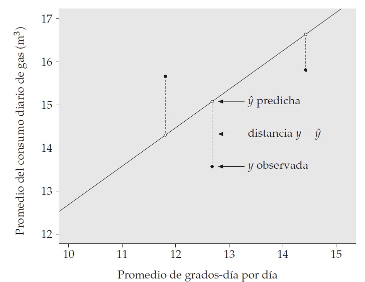 Para cada observación, halla la distancia vertical de cada punto del diagrama de dispersión a la recta. La regresión mínimo-cuadrática hace que la suma de los cuadrados de estas distancias sea lo más pequeña posible.