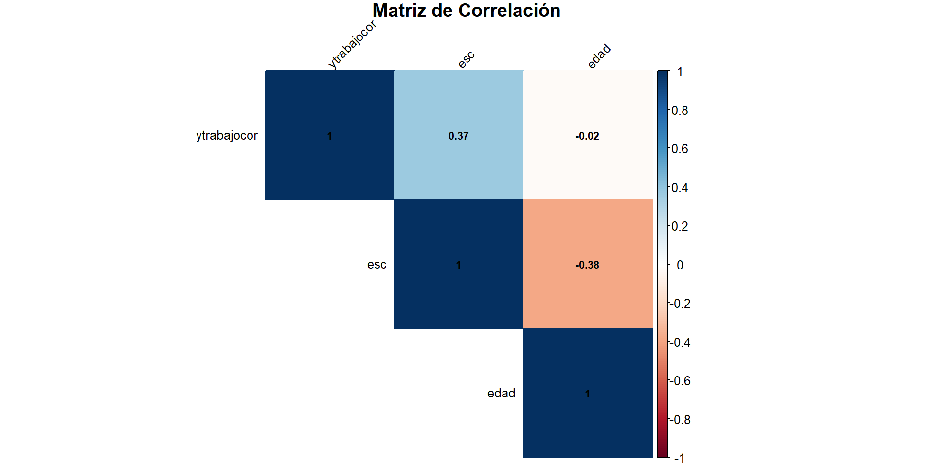 La correlación entre Años de Escolaridad y Edad es -0.38 , lo que indica que a mayor edad, en promedio, los años de escolaridad son menores.