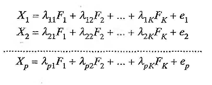 Cada variable observada X¡ se expresa mediante una combinación lineal de un número pequeño de factores comunes latentes y un factor único, también latente. Estos últimos representan la parte de la varianza de la variable observada que “no” es explicada por los factores comunes. La elección de la letra “e” para denotar al factor único procede de su consideración como “término de error”.
